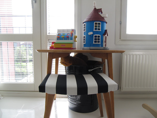 Huoneessa on jotakin itsetehtyä ja kierrätettyä. Matto on itse tehty , samoin hyllyssä pilkottava (roikkuva) vihreä lelukori. Pöytä ja pieni rahi on miehen isotädin jäämistöstä perittyjä 60 -luvun huonekaluja. Alkuperäisenä ajatuksena oli maalata kalusteet valkoiseksi, mutta ajanpuutteen vuoksi se jäi tekemättä. Nyt olen enemmän kuin tyytyväinen, että en kerennyt pensseliin koskea!