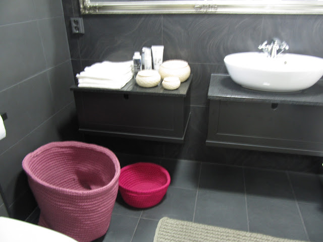 Tummat kaakelit ja pinkit virkatut korit. Onnistunut väriyhdistelmä!