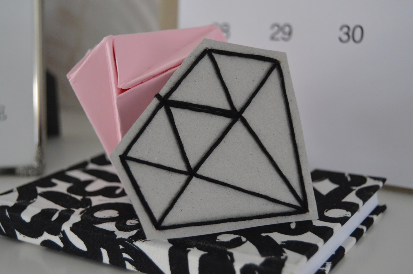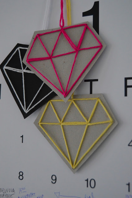 Omat timanttiseni leikkelin irti paperivihkosen takakannesta ja bambulankaa pujotin neulan silmään. Halpaa ja ihanan koukuttavaa. Kokeilkaa vaikka! Mitään ajatusta mulla ei vielä oo mihin näitä lykin, mutta vaikka kirjanmerkkinä olisivat kivat, jos siis sattuu kirjoja lukemaan. Myös ihan pelkästään koristeena varsin nätit...