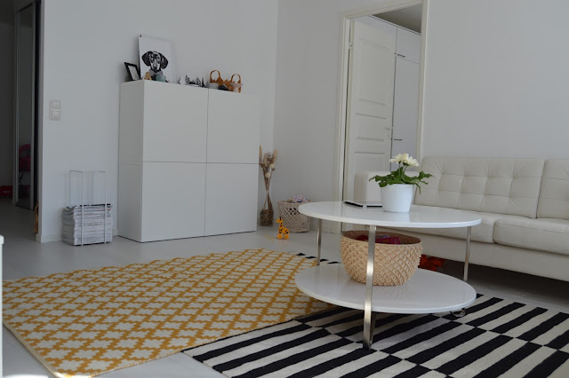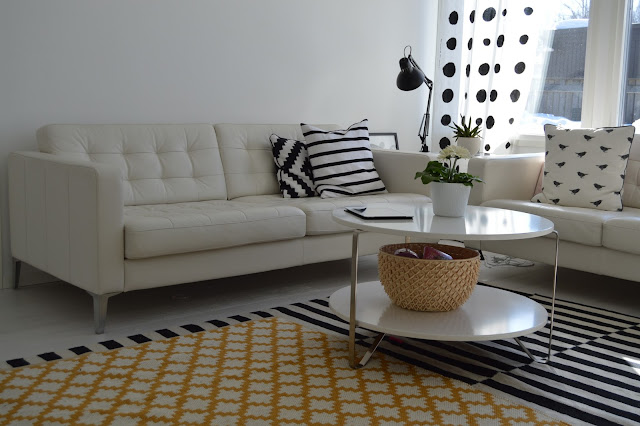 Oon pikkasen kriiseillyt tuon keltaisen Pandoran kanssa. Ei meinaa millään asettua mihinkään huoneeseen. On liian värikäs tai jotain. Emmäätiiä. Sanna Matildan uusi mustavalkoinen Pandora näytti tosi kivalle tuon samaisen Randin päällä, joten kokeilimpa samaa tyyliä itsekkin. Ihan hyvä tuli. Mattoala lattialla kasvoi, mikä on tervetullutta. Jos vaikka sen mustankin maton joskus jostain superalesta kotiin kiikuttaisi.