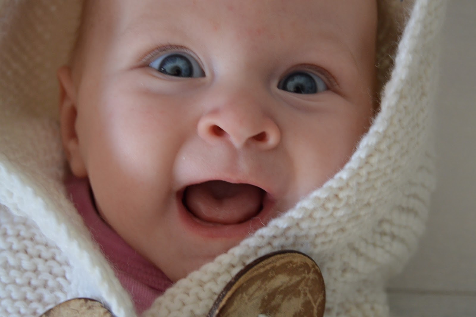 Syksyllä neulomani silloin suuren suurelta näyttänyt villatakki on jo sopiva. Ikää vauvalla kolme kuukautta ja risat. Kohta huomaan, että takki onkin jo pieni.