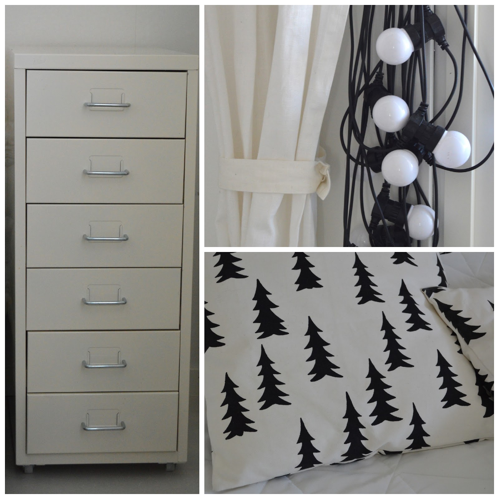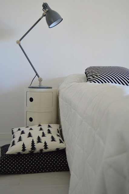 Kerrankin sain hetken olla yksin aamulla, kun suurin osa perheestä oli uimassa. Ja pienin tuhisi unilla. Iski siis tehokas sisustuspuuska, joka oli käytettävä hyväksi. Hyökkäsin makuuhuoneen kimppuun. Siirsin Hemnes yöpöydät pois. Tilalle Componibili ja toiselle puolelle Ikean metallinen laatikosto. Olohuoneesta nappasin myös tuon valaisimen... Saa nähdä kauanko ovat noilla paikoillaan, mutta nyt ainakin tämän hetken ne on hyvät siinä.
