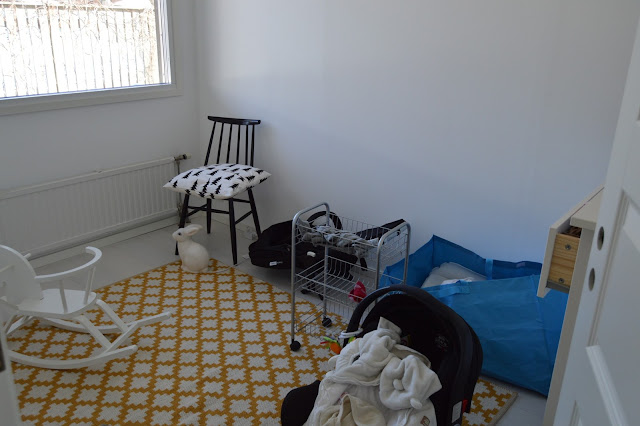 Tämä huone ei ole vielä käytössä, pienin tänne joskus majoitetaan. Eipä ole kovin kodikasta vielä. Kuten näkyy, tässä huoneessa säilötään turvakaukaloa sekä rattaiden toista istuinta. Tuo ritiläkärrykin on hyvin tarpeen tuolla. Sininen kassi on täynnä pieniä vauvanvaatteita ja muuta vauvatavaraa. Joskus ne siitä ehkä johonkin liikahtaa...